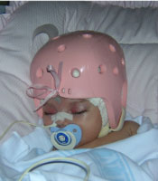 Una espuma suave de 6,4 mm de espesor con perforaciones que forman un casco protector para la cabeza del recién nacido. Una suave cinta en el mentón mantiene el casco en su sitio. El casco se puede recortar en la parte delantera, para un mejor ajuste o en la parte trasera, para tener en cuenta las diferencias occipitales. En este caso, la espuma quedaría sin capa de pintura aunque seguiría siendo impermeable y lavable.